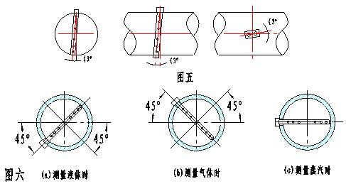 3、對(duì)于垂直管道,檢測(cè)桿可安裝在管道水平面沿管道圓周360°的任何位置上,高低壓引壓管接頭應(yīng)處于同一水平面上。對(duì)于水平管道,在測(cè)量液體時(shí)檢測(cè)桿插入位置應(yīng)位于管道橫截面水平面中心線45°以下的范圍內(nèi);測(cè)量氣體時(shí)檢測(cè)桿插入位置應(yīng)位于管道橫截面水平面中心線45°以上的范圍內(nèi);測(cè)量蒸汽時(shí)檢測(cè)桿應(yīng)水平插入,見(jiàn)圖六: